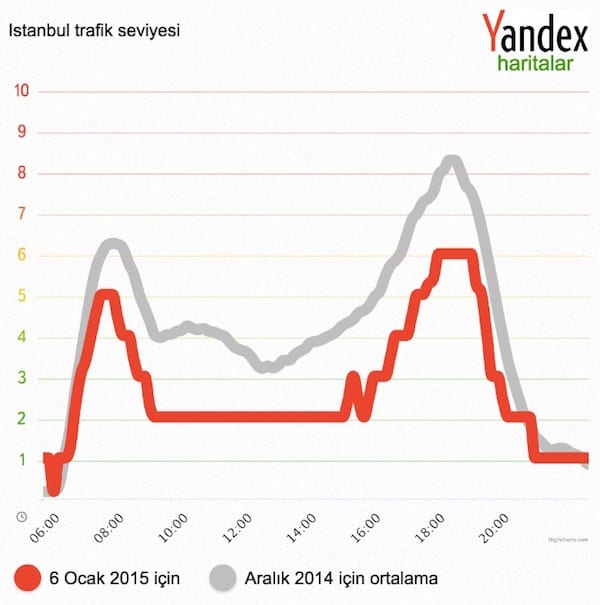 Yandex Trafik Bilgi Ajansı’ndan alınan bilgiye göre 7 Ocak sabahı, son 3 ay içinde İstanbul’da trafiğin en rahat olduğu sabah oldu. İstanbul Valiliği’nin okulları tatil etmesi, medyanın uyarıları ile çalışanların kişisel araçları yerine toplu taşımayı tercih etmesi trafiğin büyük ölçüde rahatlamasını sağladı. Sabah saatlerinde Yandex trafik endeksine göre 10 üzerinden 3 seviyesinde olan trafik, öğlen ise en fazla 2 seviyesine ulaştı. İstanbul’da son 3 ayın genelinde sabah erken saatlerde trafik endeksinin ortalama 6, öğlen ise 3-4 seviyelerinde olduğu görülüyor.