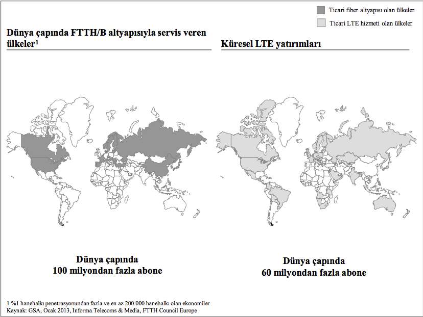 Teknoloji eğilimleri de tüketim ortamını desteklemektedir. Yeni teknolojiler cihaz formlarını değiştirmekte, cihazlar arası yakınsama görülmekte ve cihaz başına veri kullanımının önümüzdeki 5 yıl içinde 4-5 kat artması beklenmektedir. Bu yeni nesil yüksek veri tüketen cihazların etkin kullanımını sağlayabilmek adına altyapı şebekelerinin de yeni nesil teknolojilerle desteklenmesi gündeme gelmektedir. Dünya çapında yaygın fiber ve LTE yatırımları başlamıştır. Halen tüm dünyada 100 milyondan fazla abonenin fiber hizmetlerinden, 60 milyondan fazla abonenin de LTE hizmetlerinden faydalanabildiği tahmin edilmektedir. Önümüzdeki yıllar içerisinde bu sayıların katlanarak artması beklenmektedir.