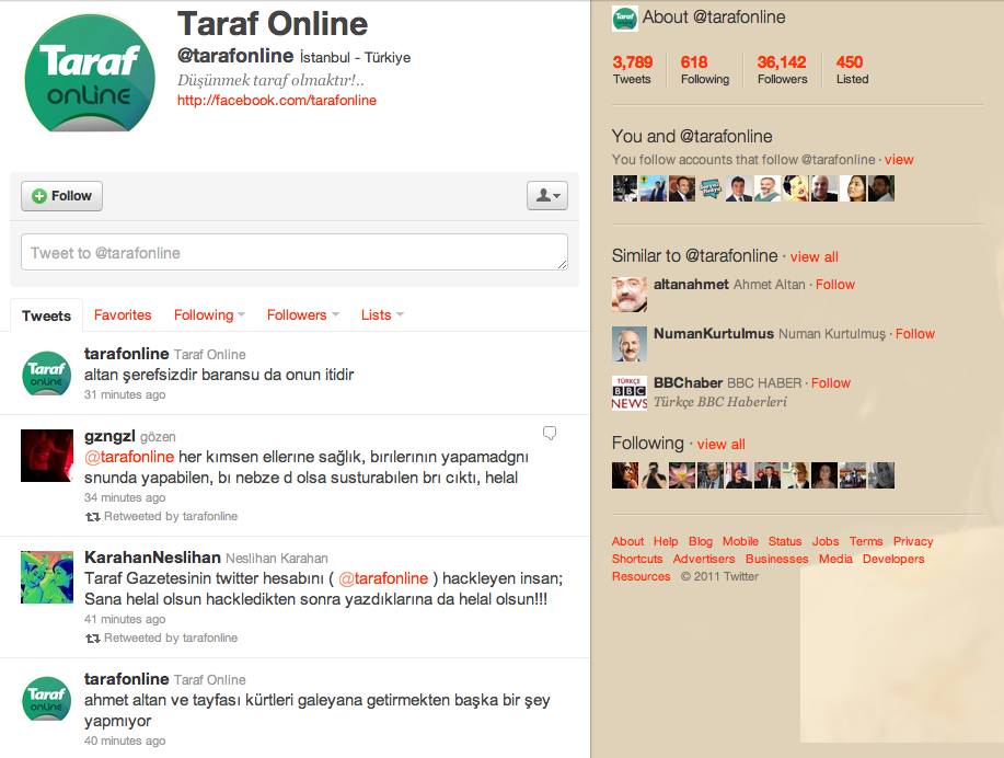 Henüz halka açılmamış dokümanları yayımlamaya verdikleri önemi sosyal medya kullanımına veremeyen Taraf gazetesi Twitter hesabını bilgisayar korsanlarına kaptırdı. Bilgisayar korsanları aşağıdaki mesajları ileterek Taraf gazetesi ve yazarlarını protesto etti: