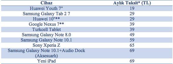 Turkcell müşterileri, 3G’li tabletlere ayda 19 TL ile 69 TL arasında değişen fiyatlara ve 24 ay kontratla her ay 250 MB internet içinde sahip olabiliyor. Ayrıca kontratlı tekliflerin 1GB, 4GB ve Sınırsız internet dahil paket seçenekleri de Turkcell’lileri bekliyor. Turkcell, cihazlarını peşin almak isteyenler için de avantajlı seçenekler sunuyor. Peşin ödeme seçeneğini İş bankası, Garanti Bankası ve Yapı Kredi Bankası kredi kartlarına sıfır faiz ile 12 ay taksitlendirmek mümkün. Üstelik, tabletini peşin alanlara 3G hızını deneyimleyebilmeleri için ilk ay 1GB internet Turkcell’den hediye!